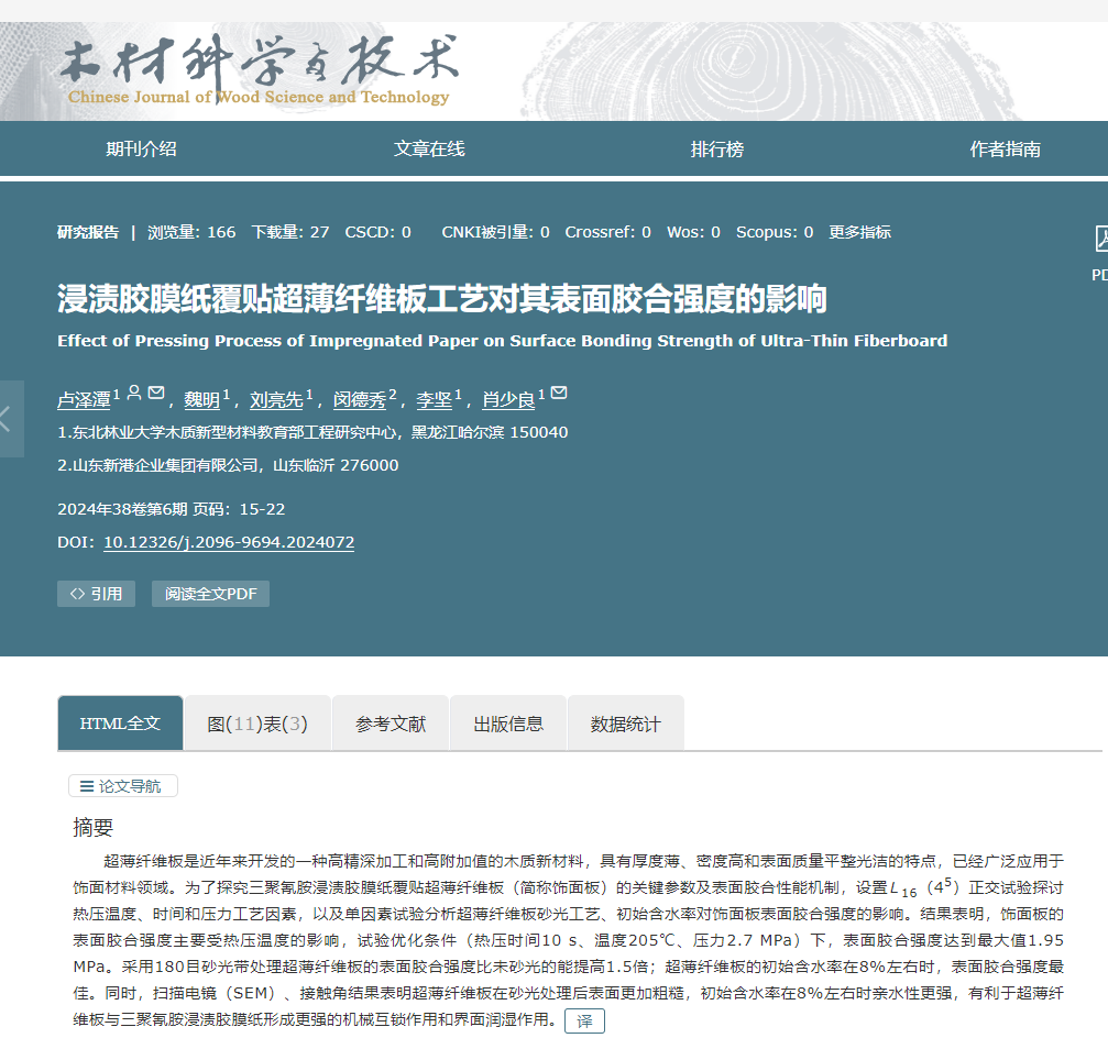 该研究以“浸渍胶膜纸覆贴超薄纤维板工艺对其表面胶合强度的影响”为题发表在《木材科学与技术》2024年38卷第6期上,得到了2023年山东省重大创新工程项目“特种木质新材料制造关键技术”(ZQTYB240700001)等项目支持。东北林业大学硕士研究生卢泽潭为第一作者,肖少良教授为通讯作者。