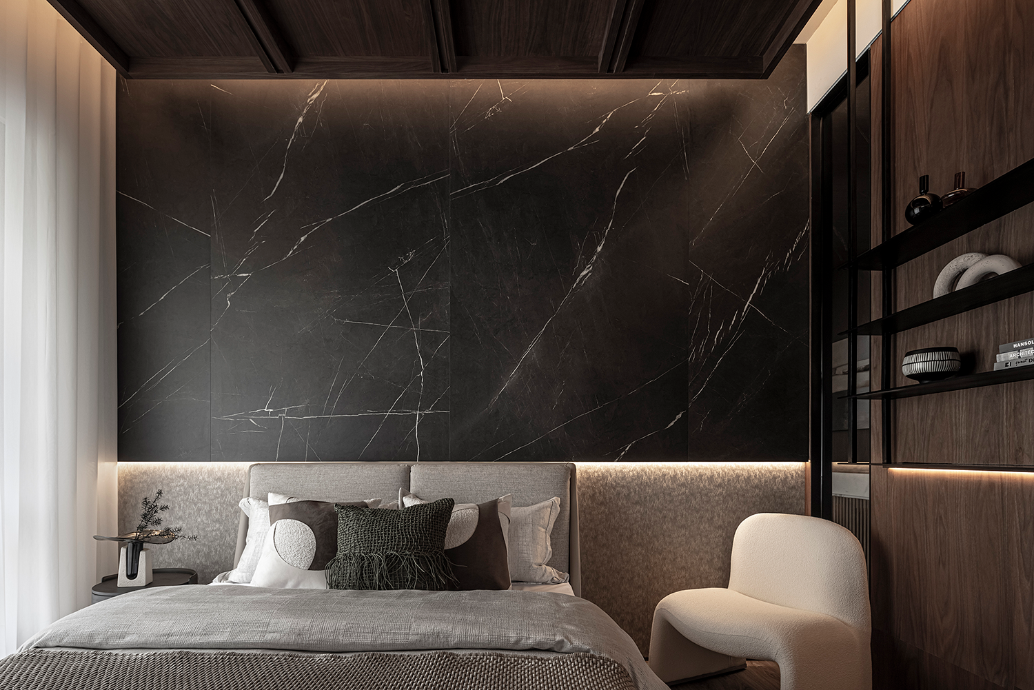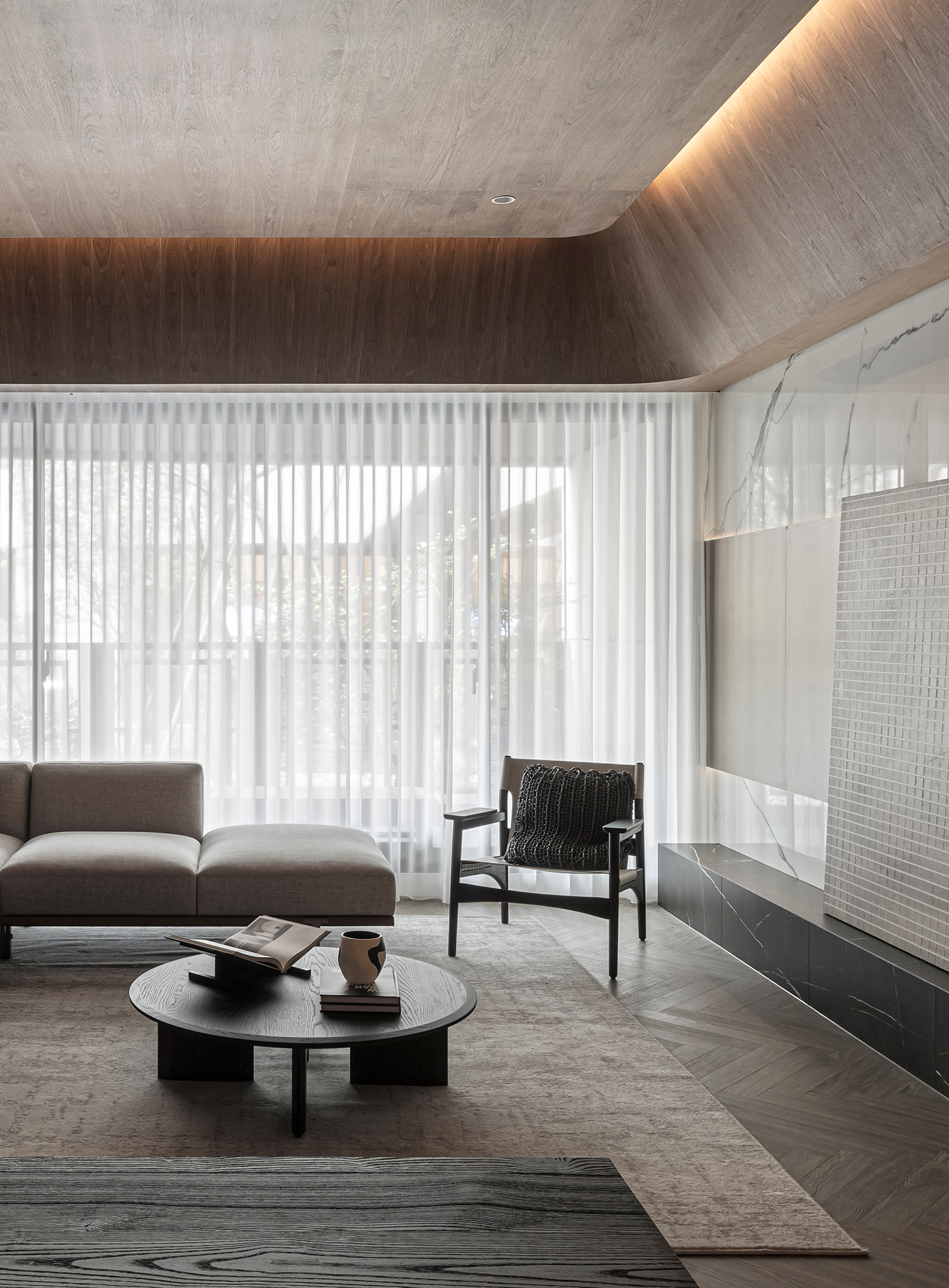 唐忠汉大师深谙此道,以石材的浑厚、木质的温润、织品的细腻层层叠加,精妙平衡感官层次与实用功能,最终凝练成一处内敛与质感并存、经典与当代交融的生活范本。