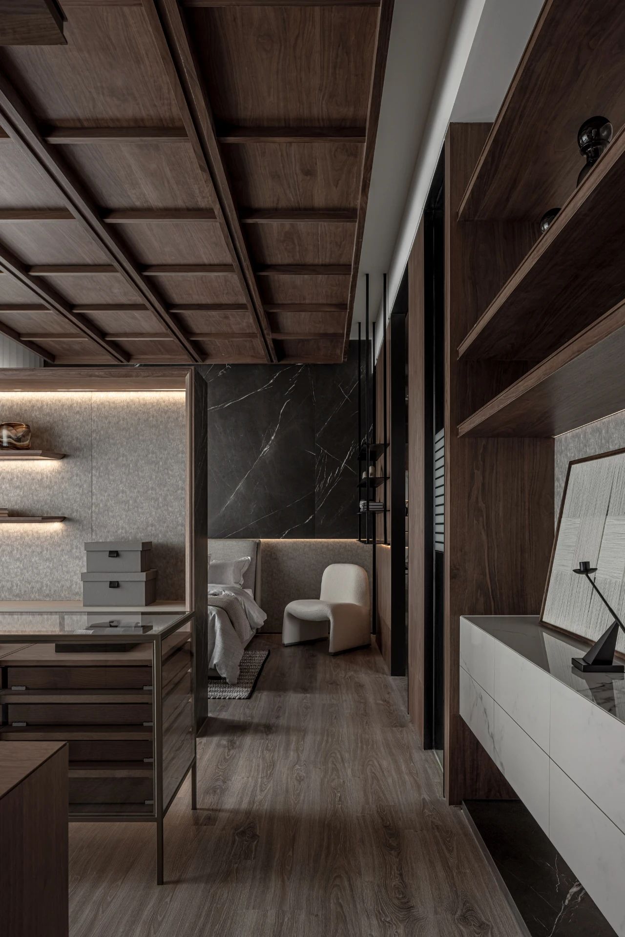 更衣室灵感汲取自精品酒店配置逻辑:独立饰品陈列区、精心规划的长衣悬挂区与叠衣展示区,搭配兼具梳妆与书写功能的工作台,共同构筑了一个集高效收纳与美学展示于一体的优雅场域。