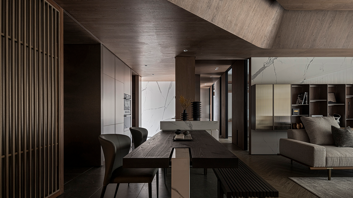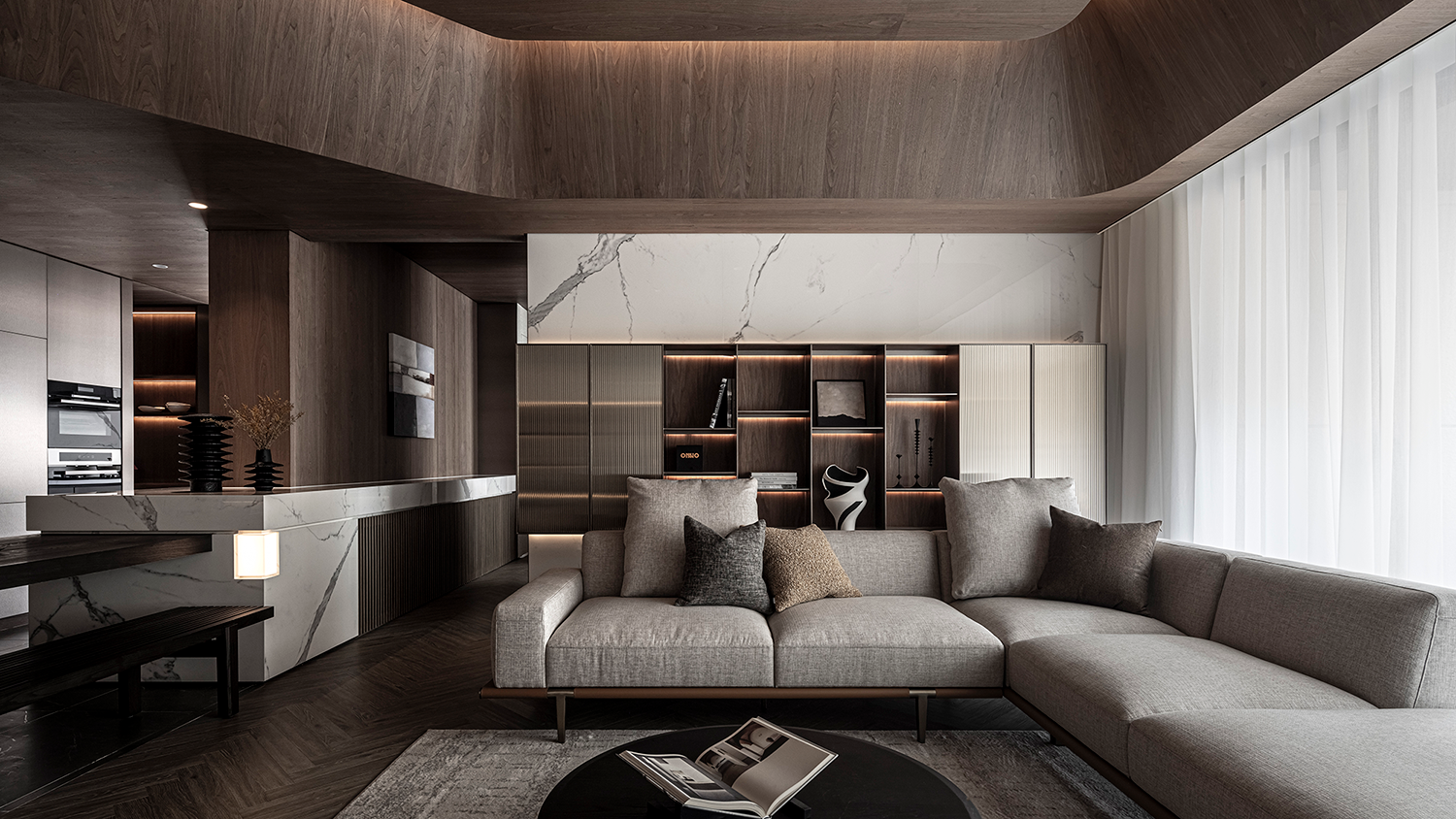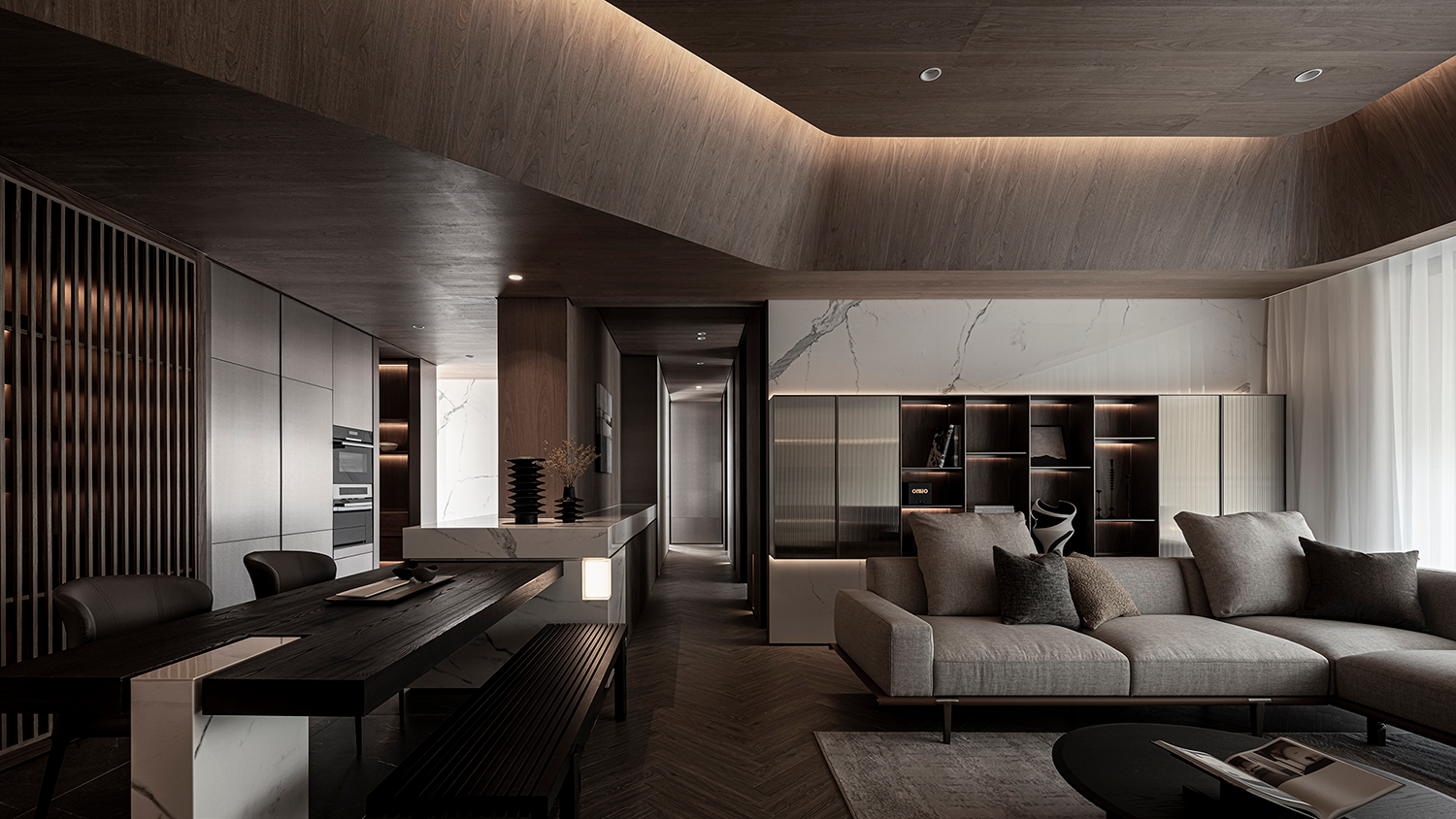 客厅底墙则运用大理石结合开放展示柜,柜门嵌入茶色长虹玻璃,独特的纹理和半透光特性,呈现更为轻盈的感受。中厨结合中岛与酒窖,整合生活机能的同时,延续金属板的材质语汇,提升整体的统一性与设计连贯性,以真实的材料打造视觉与触感的双重体验。