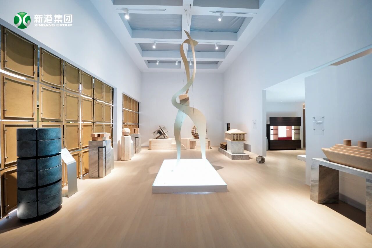 步入展位,最先惊艳目光的,是那片“光影柔织之梦”——0.5mm新港仿生超薄纤维板如丝带般轻柔飘舞,这款斩获业内首枚日内瓦国际发明展金奖的创新产品,不仅以极致轻薄的质感勾勒出独特美感,更将中国木业的原创仿生新品,稳稳带向了世界舞台中央。