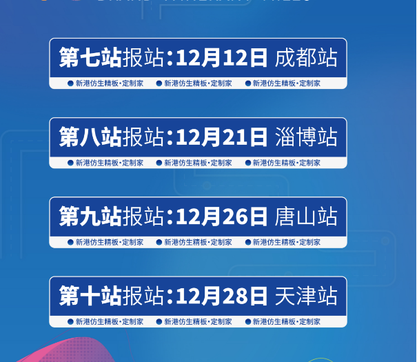 聚势前行,征程继续,12月,新港仿生精板品牌万里行将前往成都、淄博、唐山、天津四个城市站超燃接力,聚焦行业痛点,共谋未来新篇,更有神秘大咖空降现场,精彩不容错过!