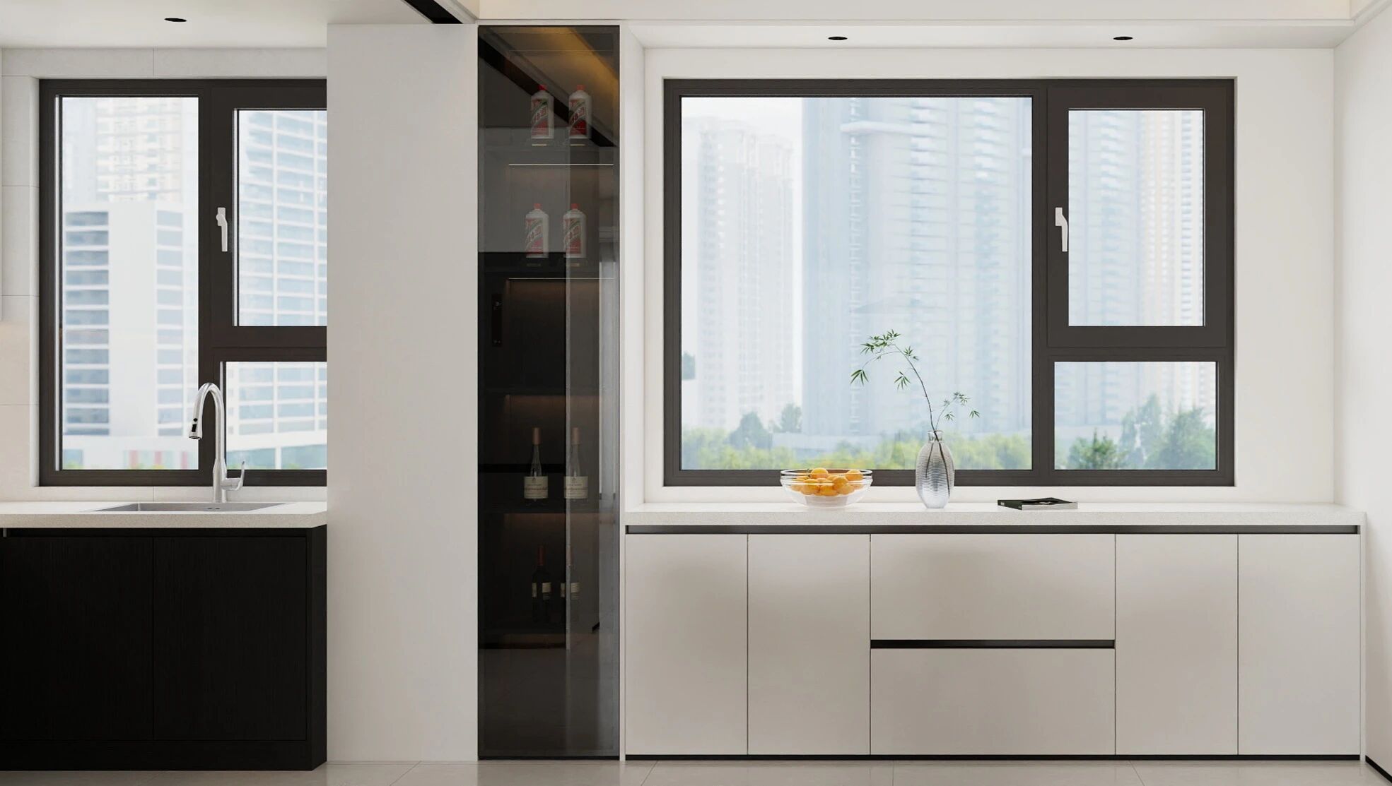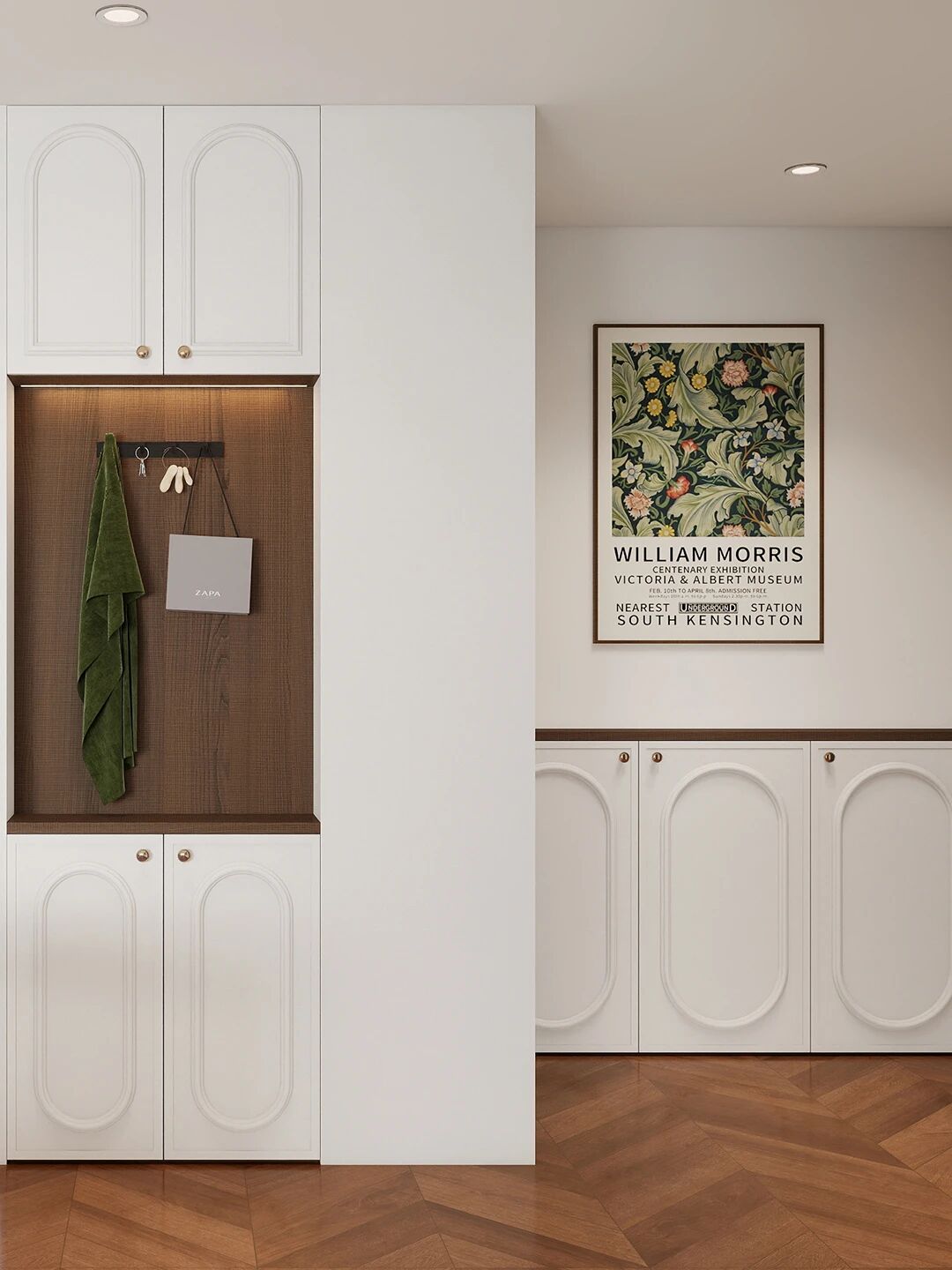 雅白在此场景中并非主角,它在餐边柜、橱柜、玄关柜的细节中静静营造空间的呼吸感。