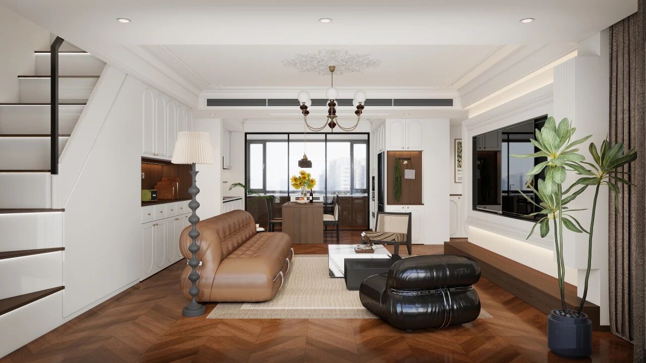 开放式的设计打破传统客厅、餐厅的界限。视觉上,天花板、餐边柜、电视背景墙、室内台阶均为白色系,营造出漂浮灵动的感受。地板、沙发、落地灯柱、餐桌均为棕咖、黑色系,中和了白的飘渺,对色彩的极致应用,构建出空间的韵律与美感。